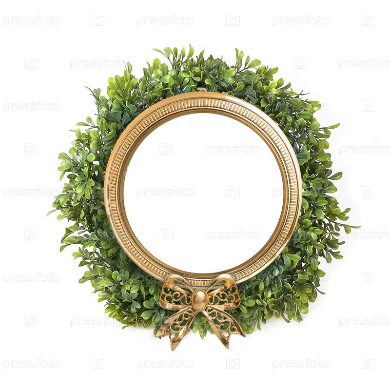 Золотая рама с рождественским декоративным зеленым венком изолирована на белом фоне