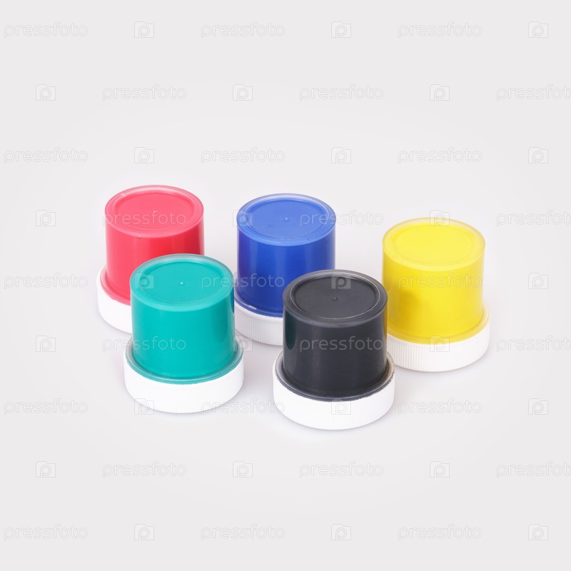 Бутылки с разноцветными гуашью изолированы на белом фоне