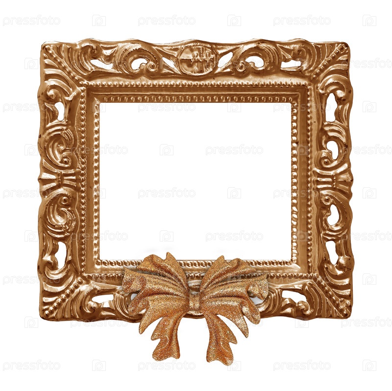 Золотая рама с рождественским декоративным луком изолирована на белом фоне