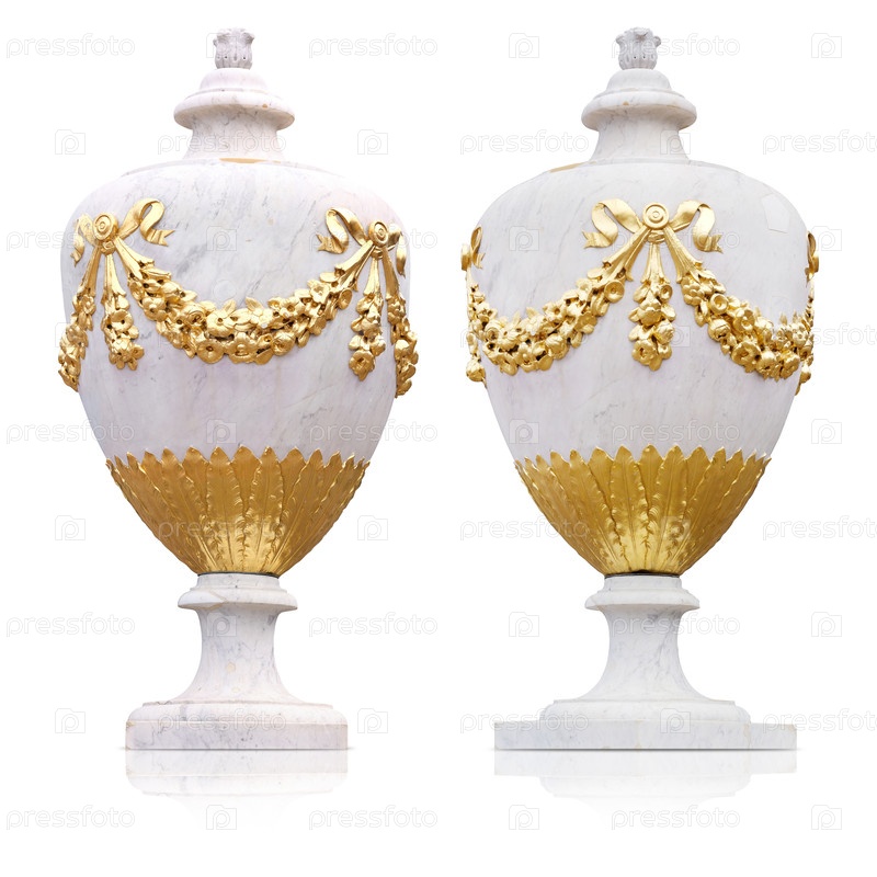 Антикварная декоративная мраморная ваза с золотым цветочным декором изолирована на белом фоне. Элемент дизайна с обрезкой пути