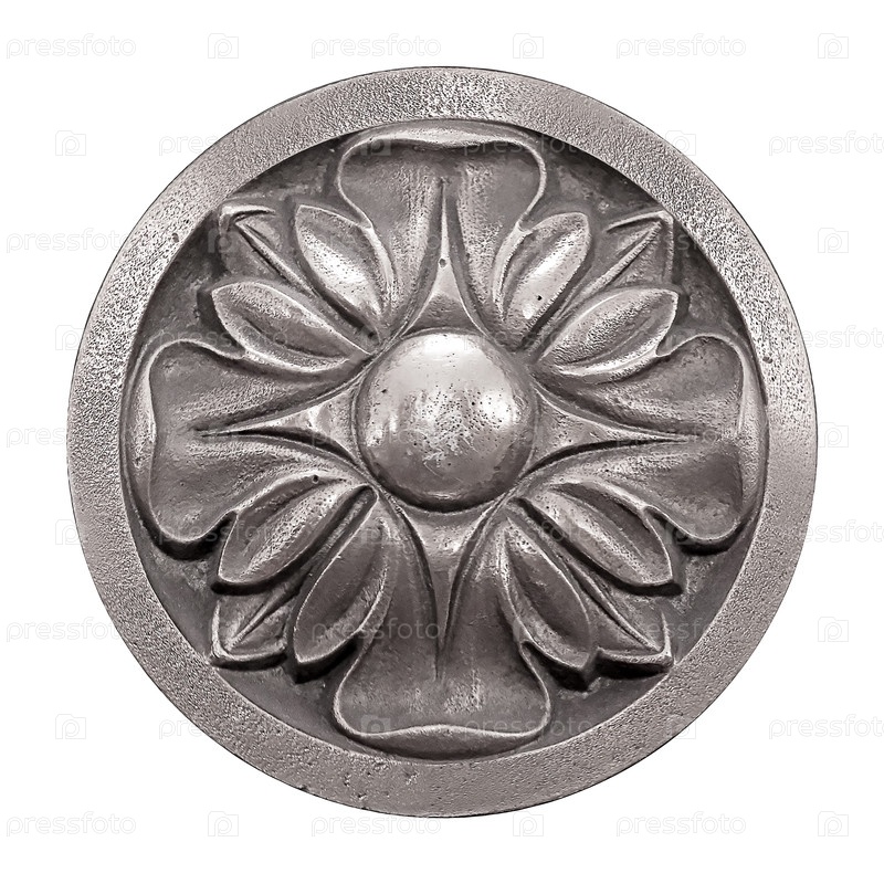 Круглый серебряный декоративный элемент с цветочным рисунком, выделенным на белом фоне