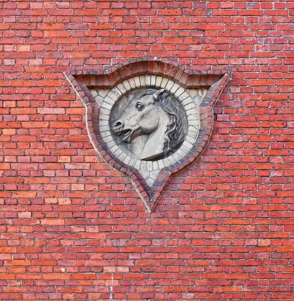 Изолированное символическое изображение головы лошади в картуше на стене из красного кирпича