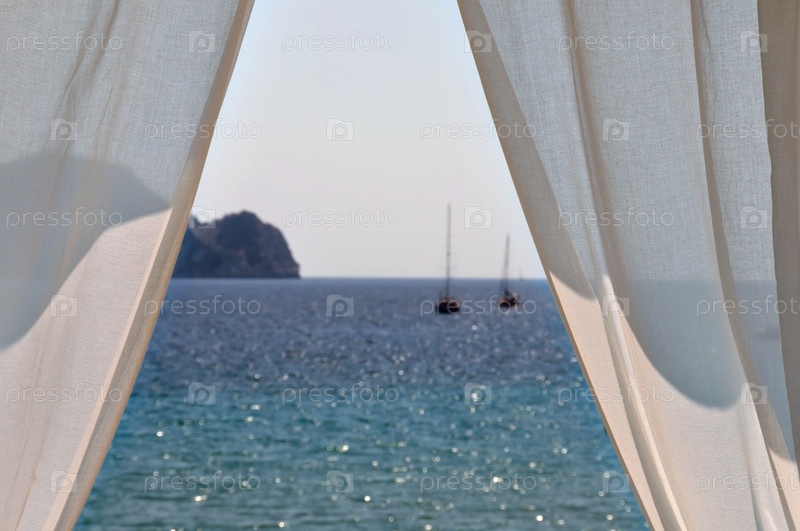 Белые шторы и лодки на берегу моря