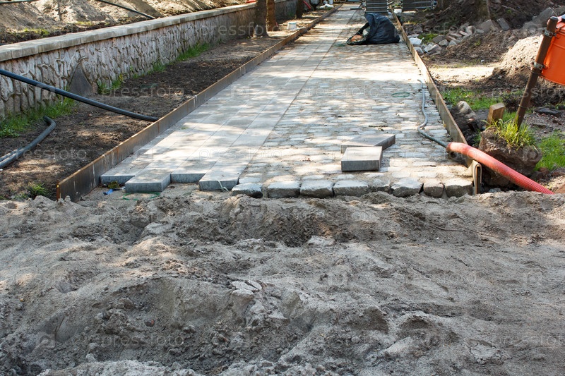 Строительство нового современного тротуара в городе в солнечный летний день