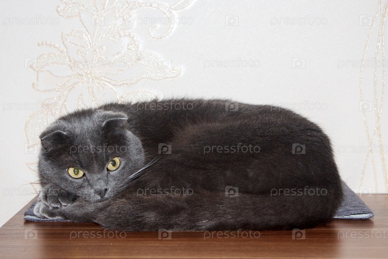 Кошка лежит на тумбе. внутри помещения, крупным планом