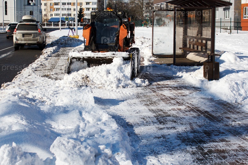 Мини-трактор очищает снег с тротуара в солнечный зимний день