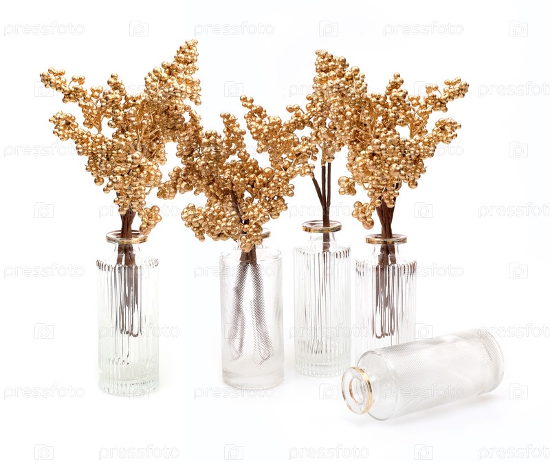 Золотые декоративные ветви растений в стеклянных вазах выделены на белом фоне