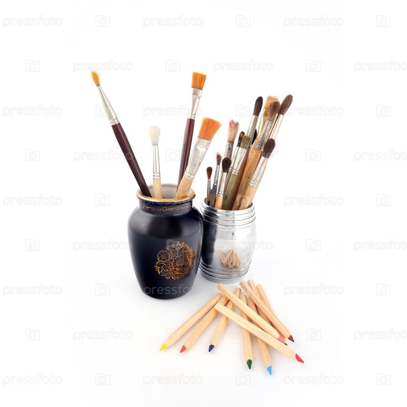 Бруски художника в вазе, изолированной на белом фоне