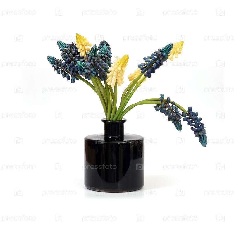 Букет искусственных цветов в черной стеклянной вазе, выделенной на белом фоне