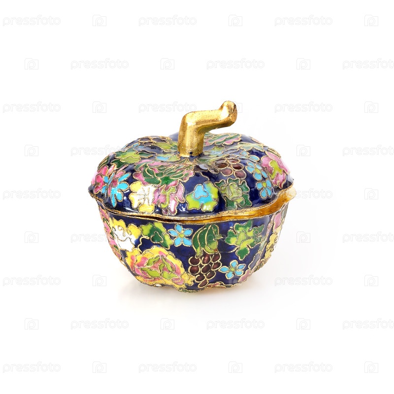 Традиционная китайская металлическая коробка, украшенная разноцветной эмалью, изолированной на белом фоне