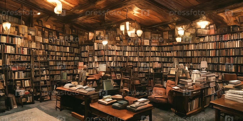 Магическая библиотека с витриной возвышающихся полок древних томов, развевающихся пергаментов, мистических артефактов. Генеративный ИИ
