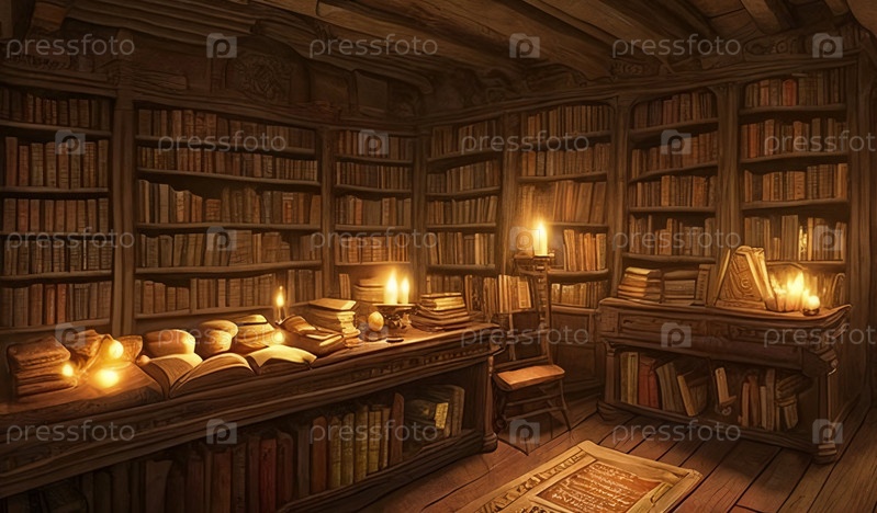 Шаг в Зачарованный книжный магазин Nestled, его полки содержат старинные книги в танцах теней под свечами на древних томах