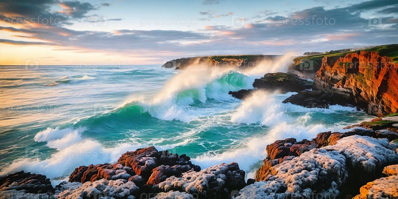 Потрясающий морской пейзаж, скалы, возвышающиеся над береговой линией, волны, обрушивающиеся внизу. Панорама. Генеративный ИИ
