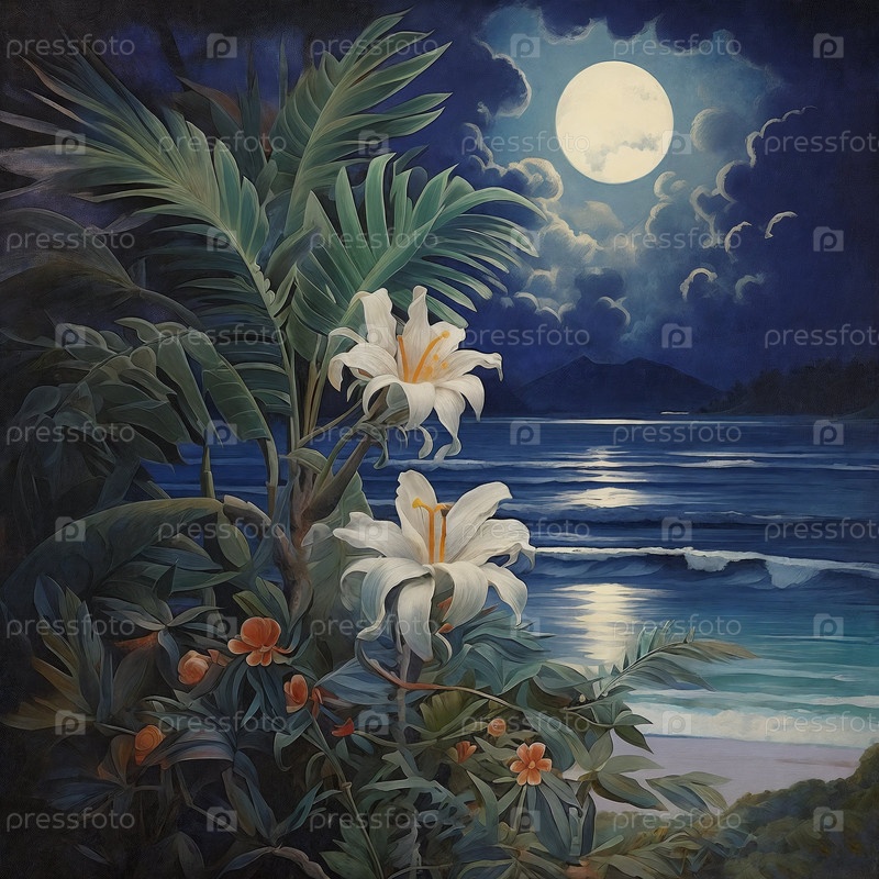 Иллюстрация полнолуния поднимается над морем. Генерирующий ИИ