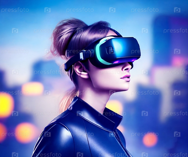 Женский портрет в VR-очках, город на заднем плане генеративный ИИ