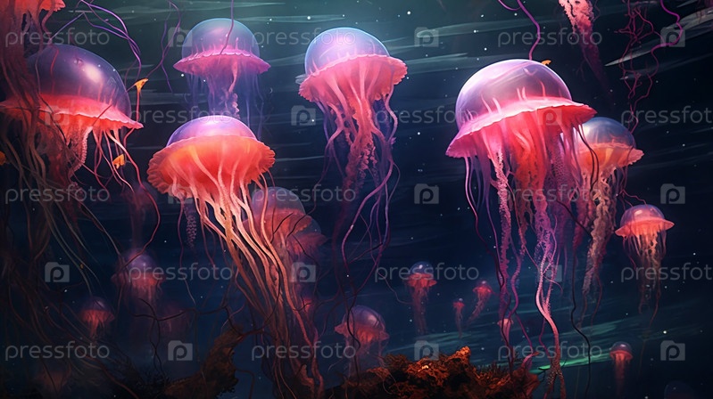 Медузы под водой крупным планом, солнечный свет сквозь воду. Генерирующий ИИ