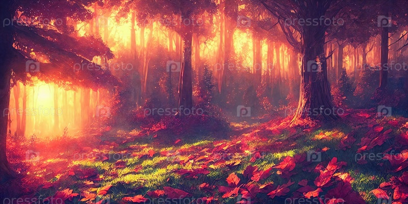 Фантастический сказочный лес с красочными листьями на закате. ИИ генеративный