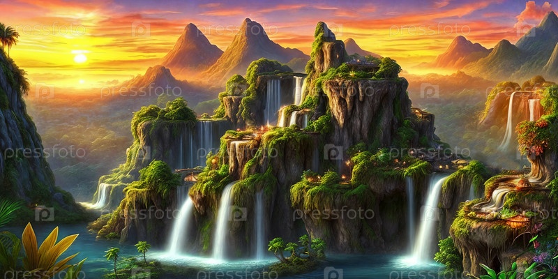 Фантазийный пейзаж с водопадами, панорама. Генерирующий ИИ