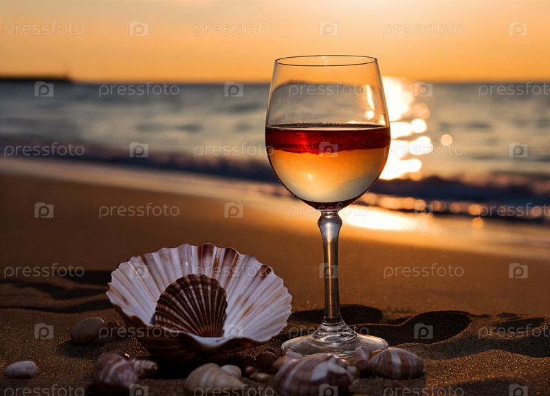 Бокал белого вина и ракушка на пляже на закате. Генерирующий ИИ