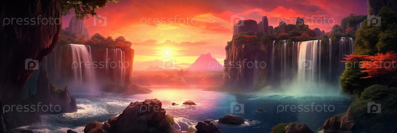 Фантазийный пейзаж с водопадами, панорама. Генерирующий ИИ