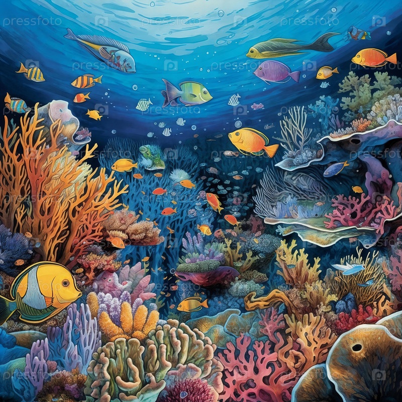 Подводный ландшафт с коралловыми рифами и тропическими рыбами. Генерирующий ИИ
