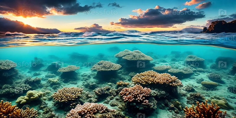 Яркий закат рисует небо теплыми оттенками, поскольку морская поверхность отражает красочное зрелище, а внизу разворачивается разнообразная и яркая подводная панорама. Генерирующий ИИ