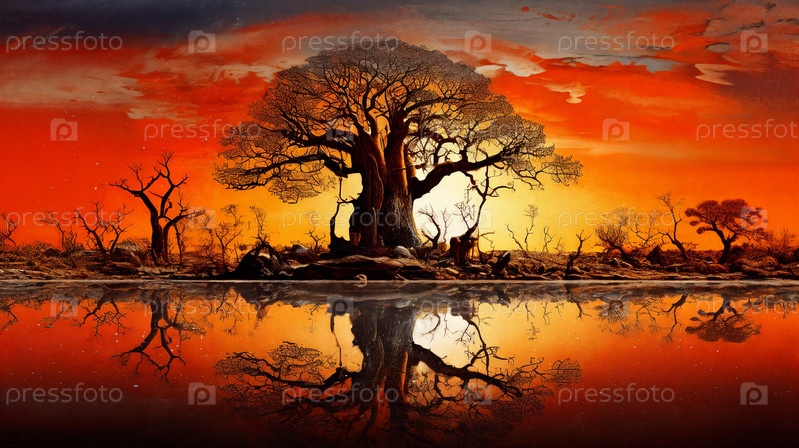 Величественное дерево стоит высоко у спокойного озера под закатным небом. Панорама. Генерирующий ИИ