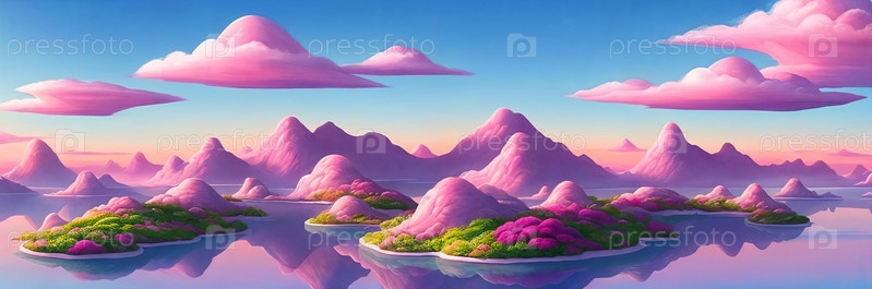 Сюрреалистический и сказочный пейзаж плавучих островов, подвешенных в пастельном небе, соединенных нежными мостами и украшенных экзотической флорой