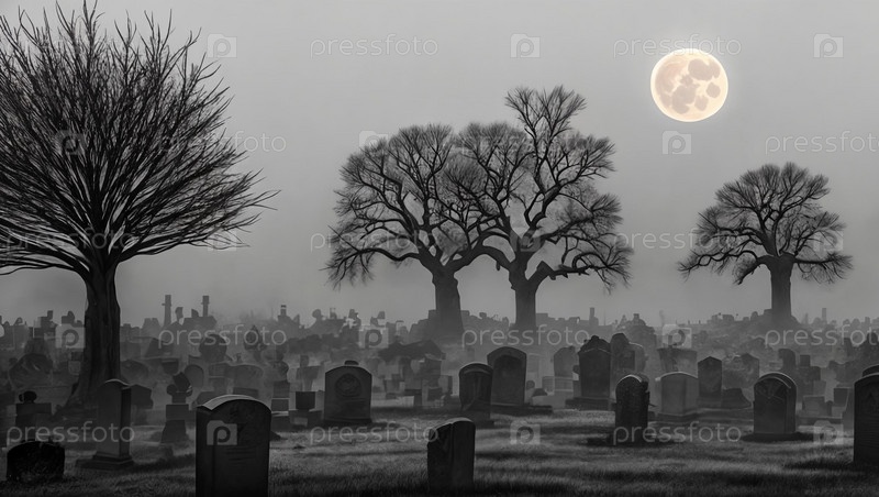 Призрачно красивое кладбище, окутанное туманом, с выветрившимися надгробиями, стоящими охранником среди помятых деревьев и скрученных ветвей, тянущихся к Луне