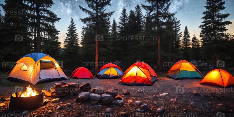 Лагерь уютный. Устройте уютную кемпинг-сцену с палаткой под звездным ночным небом, освещенной теплым костром. Панорама