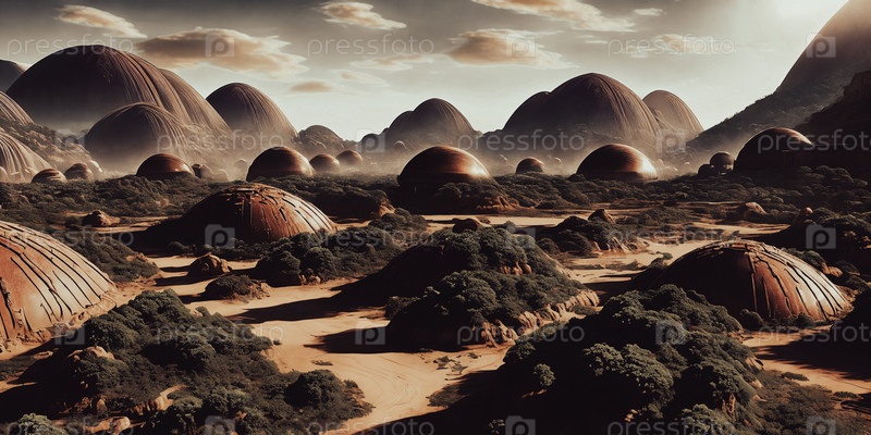 Цифровое произведение искусства трансформированного поселения на Марсе в будущем, демонстрирующее куполообразные среды обитания, терраформирующее оборудование и обильную зелень, превращающую красную планету в пригодный для жизни мир