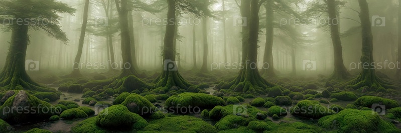 Добро пожаловать в Мистический лес Древние деревья, покрытые туманом, покрытые мхом скалы, свет, фильтрующий листву. Откройте для себя очарование в каждом углу этого эфирного царства. Генеративный ИИ