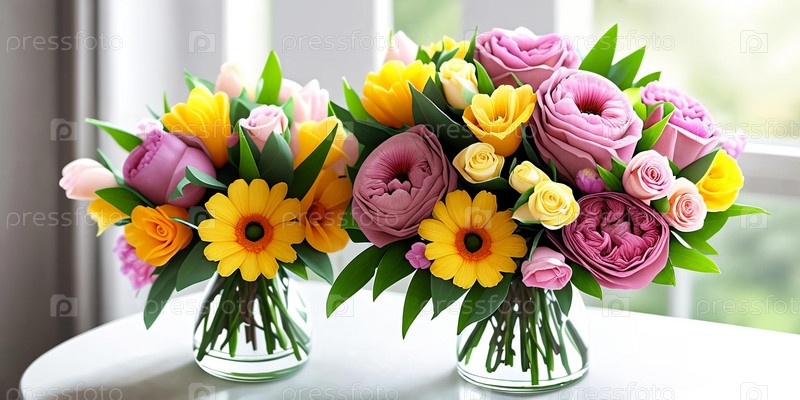 Цветочная элегантность. Яркий букет весенних цветов, расположенных в стильной вазе с мягким естественным освещением, чтобы символизировать элегантность и женственность