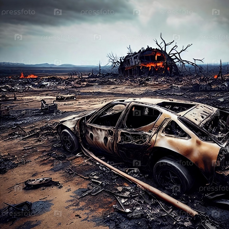 Разрушенные пейзажи. Катастрофа с выжженной землей, тлеющие обломки и мрачная атмосфера, которая передает разрушения, которые произошли