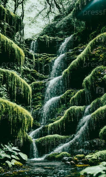 Зачарованный водопад. Водопад каскадирует вниз по покрытым мхом скалам, открывая секретный грот за его завесой. Кристалло-чистая вода сверкает намеками на магию, а по берегам цветут красочные цветы