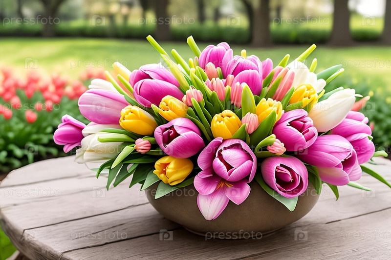 Пасхальное цветочное наслаждение. Композиция с разнообразными свежими весенними цветами тюльпанов, расположенных в декоративной пасхальной тематике, подчеркивая яркие цвета и нежные лепестки