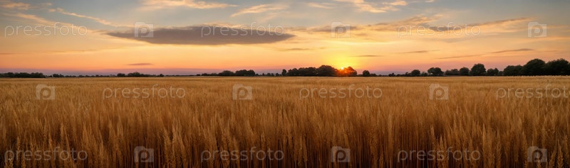 Спокойствие огромного пшеничного поля на закате, с теплыми тонами неба, отражающими золотые оттенки спелых культур