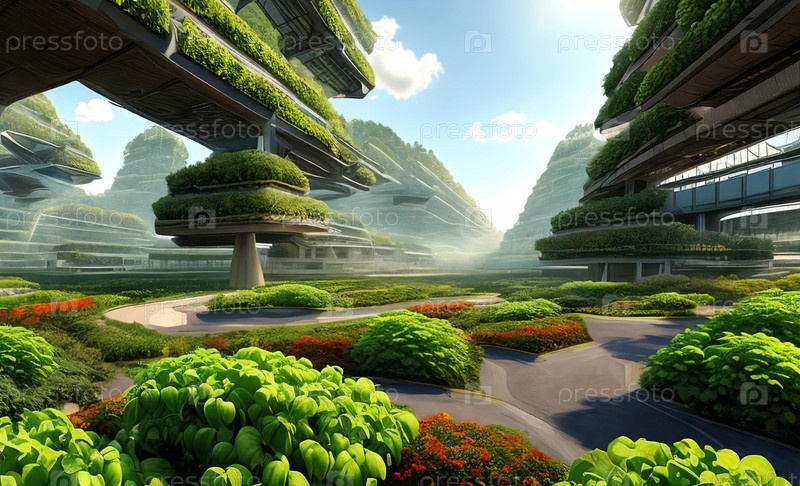 Исследуйте футуристический цифровой шедевр, представляющий высокотехнологичный сельскохозяйственный центр. Автоматизированные сельскохозяйственные машины процветают в вертикальных садах