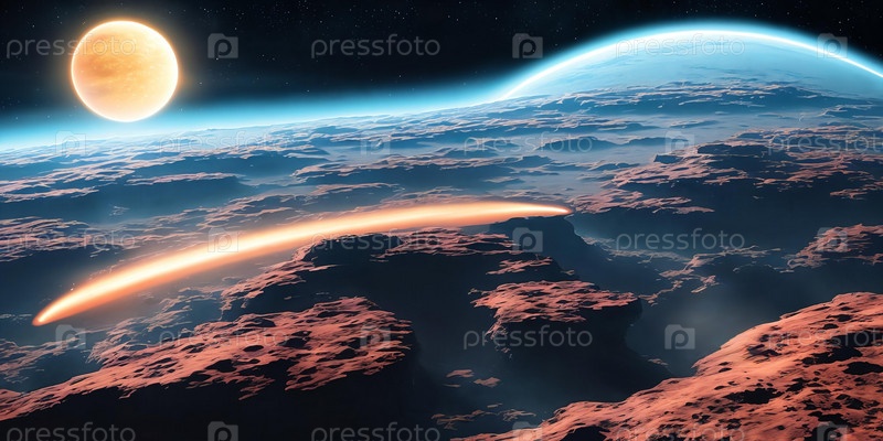 Исследование экзопланет. Гладкий космический корабль, путешествующий по яркой солнечной системе, усеянной экзотическими планетами и лунами