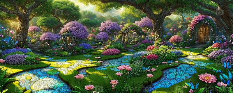 Зачарованный сад.Зачарованный сад, изобилующий фантастической флорой и фауной, сияющими цветами.Генерирующий A
