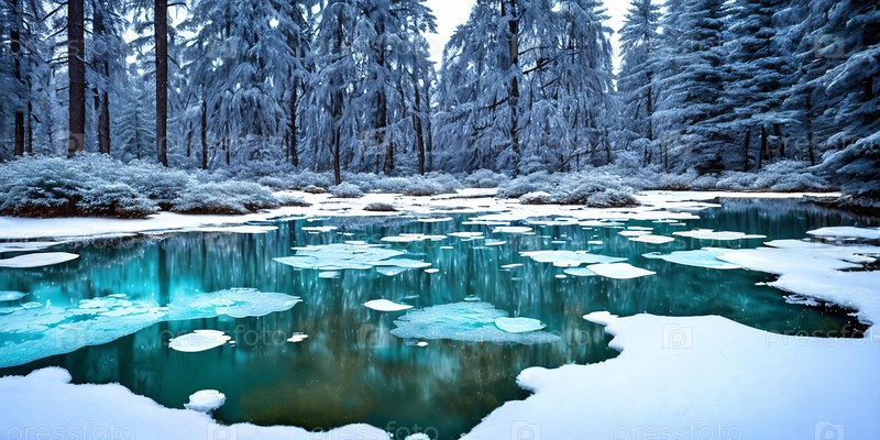 Замороженный волшебный пруд. В самом сердце заснеженного леса лежит застывший пруд. Нежные морозные узоры украшают его поверхность, а подо льдом спят мифические существа. Волшебство и магия зимы