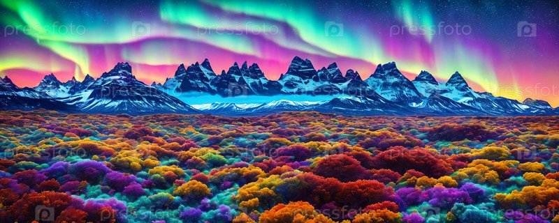 Небесная небесная планета. Планета с несколькими лунами, красочными туманностями и завораживающим северным сиянием, заполняющим небо, красочными растениями на переднем плане. Панорама. Генерирующий ИИ