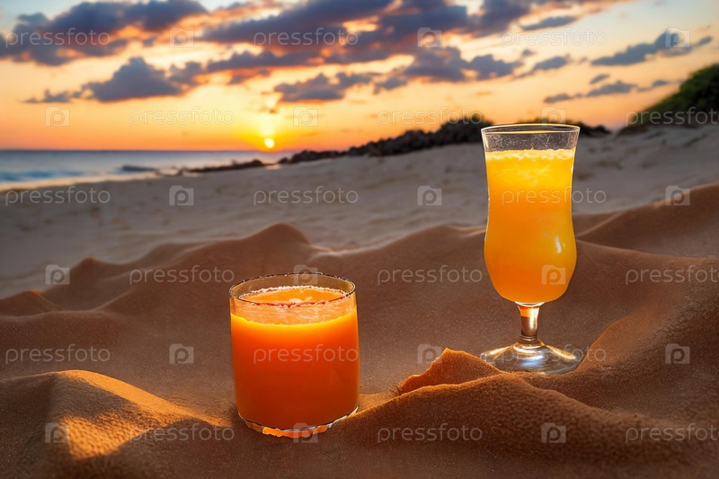 Освежающий стакан яркого апельсинового сока рядом со спелыми апельсиновыми фруктами на песчаном пляже