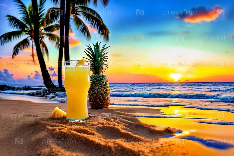 Стильные солнцезащитные очки, покоящиеся на песчаном пляже, с ярким закатом, рисующим небо в оттенках розового и оранжевого, отражающихся в линзах