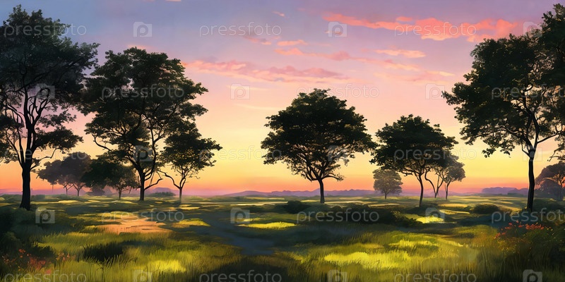 Силуэты деревьев или птиц вдали, тонко очерченные на фоне яркого заката неба