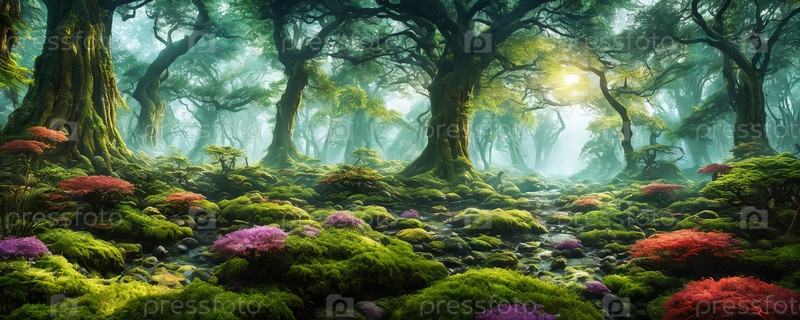 Зачарованный лес. Потусторонний лесной ландшафт с яркой, светящейся флорой и фауной, величественными древними деревьями. Генерирующий ИИ