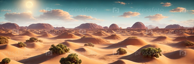 Огромное пустынное пространство с катающимися дюнами под облачным солнечным небом. Генерирующий ИИ