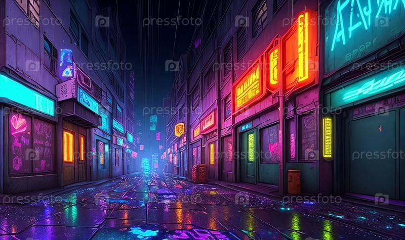 В переулке киберпанка неоновые знаки бросают жесткое свечение на голографические граффити, пропитанный дождем тротуар сверкает под зловещим небом