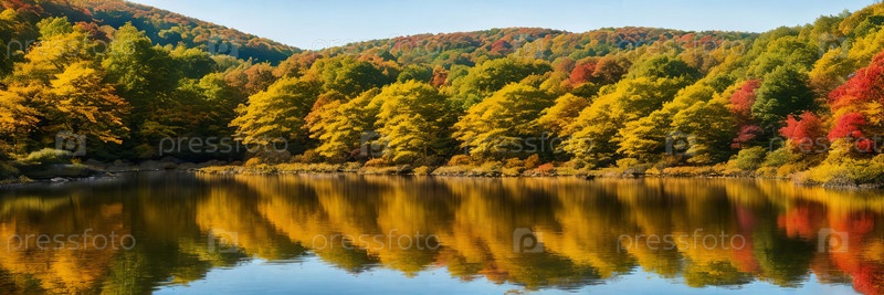 Красочная палитра осени, фокусируясь на спокойном озере, отражающем яркую листву окружающих деревьев в солнечный день