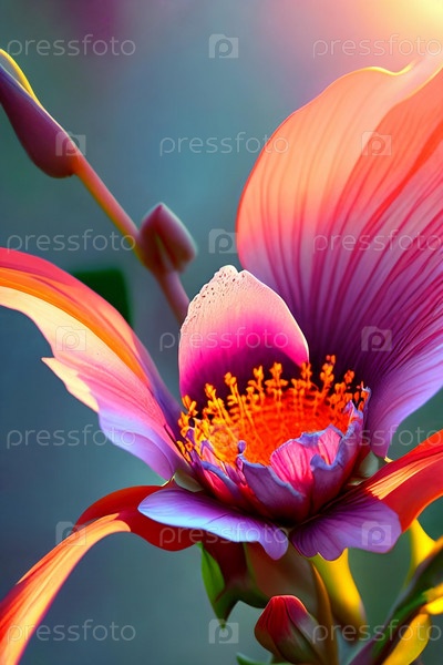 Флоральная фантазия. Сложные детали цветущего цветка, когда он ловит последние лучи заходящего солнца, выделяя его нежные лепестки и яркие цвета в мечтательном, эфирном свете